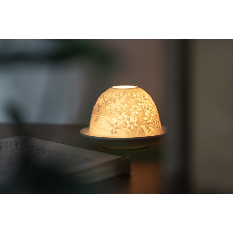 Wunderschön und sorgfältig gefertigte weiße Porzellan-Teelichthalter. Das Licht eines brennenden Teelichts enthüllt wunderschöne geprägte Muster. Voller Magie und Charme, eine Dekoration für jeden Tisch, jede Fensterbank oder jedes Regal.