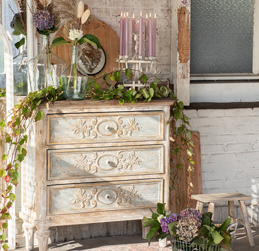 #3. Use contrasting materials: A great way to showcase the matte surfaces of vintage furniture in a shabby chic interior is by complementing them with shiny surfaces. The contrast with, for example, glass and mirrors creates a lively effect. In addition to material, there is also a lot of contrast in the design, ranging from geometric to country French with hand-carved flowers in the wood. So there is something for everyone to complement their shabby chic interior to their taste, there is even a mantelpiece available on Milatonie.nl.