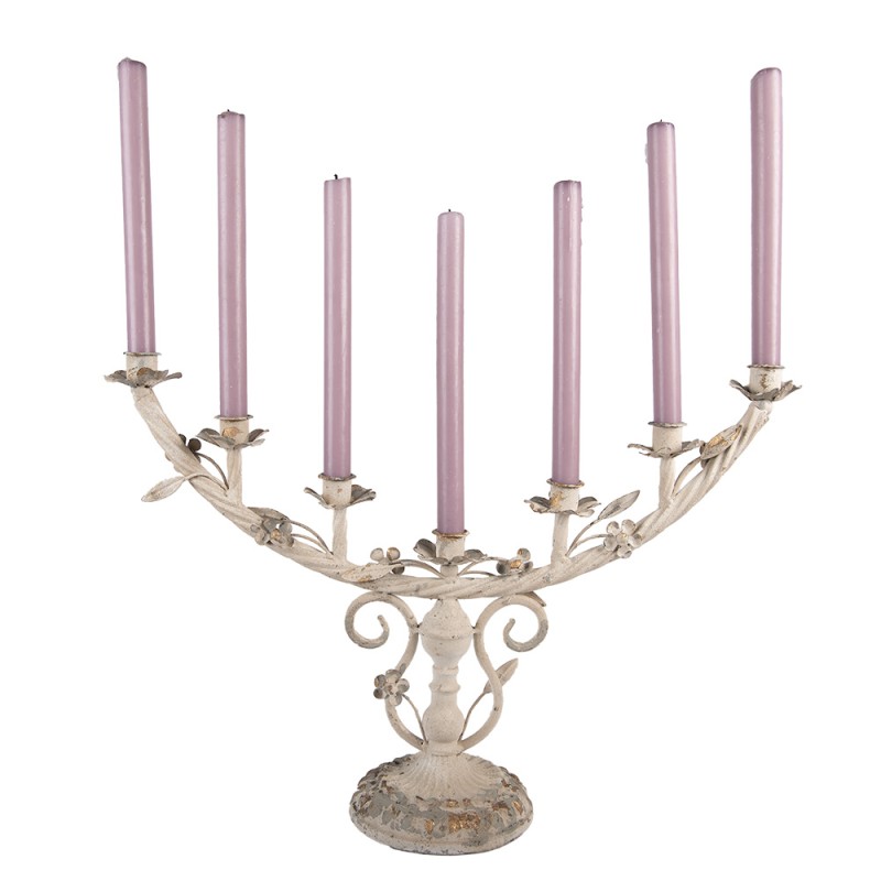 Brocante metal candelabra for 7 candles with a diameter of 2 cm. Decorated with ornamental iron leaves – a charming and atmospheric addition to any interior.