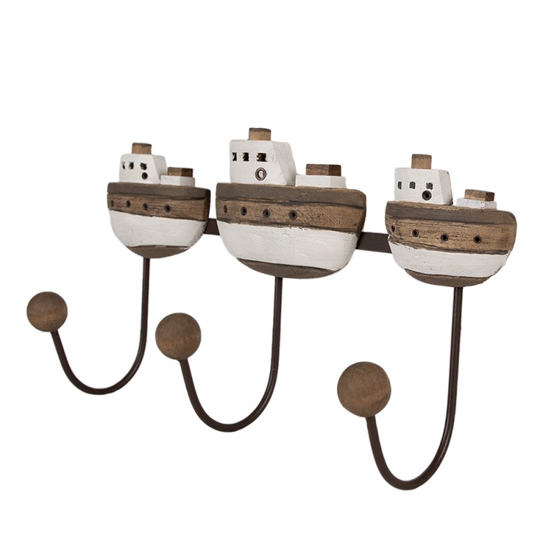 Clayre & Eef Wall Coat Rack 3 Hooks Boat 38x10x20 cm White Brown Wood