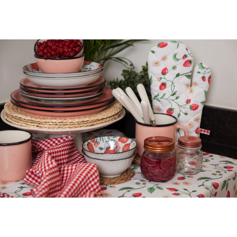 Who doesn‘t love strawberries! The sweetness and the feeling of summer are elements that can both be found in this colourful textile. This extensive textile series provides all comforts and can be implemented in detail in the (living) kitchen, living room and garden. The tablecloths, table runners, bread baskets, napkins and placemats add atmosphere to the table. The matching tableware completes this picture. The decorative cushions nicely dress chairs and benches both inside and outside. Aprons, kitchen towels, potholders and oven gloves should also not be missing in the kitchen. Bring the summer home!