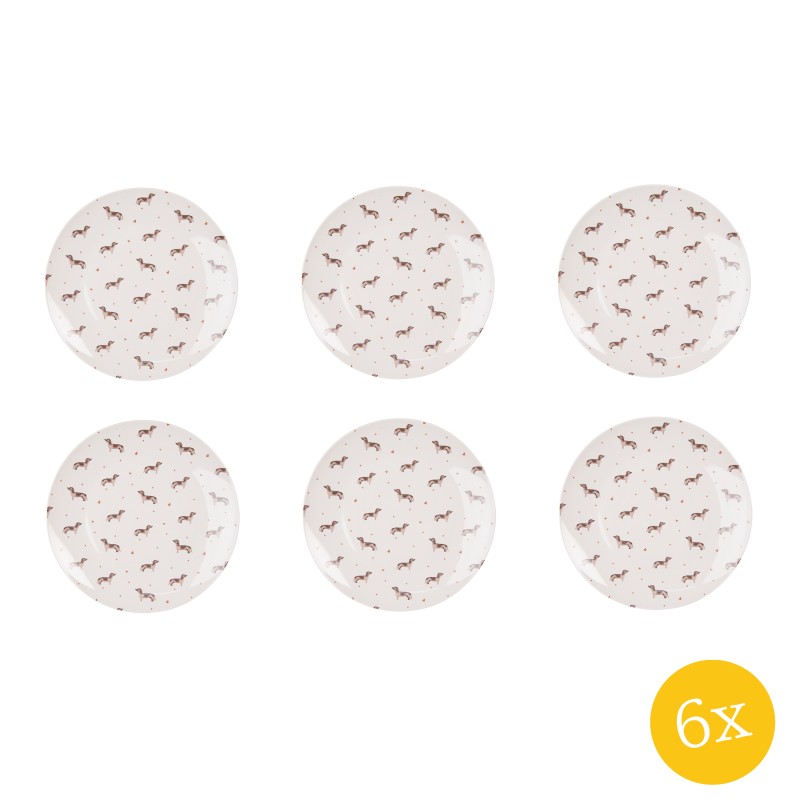 Clayre & Eef Dinerbord set van 6 stuks Ø 26 cm Beige Bruin Porselein Rond Teckels Eetbord