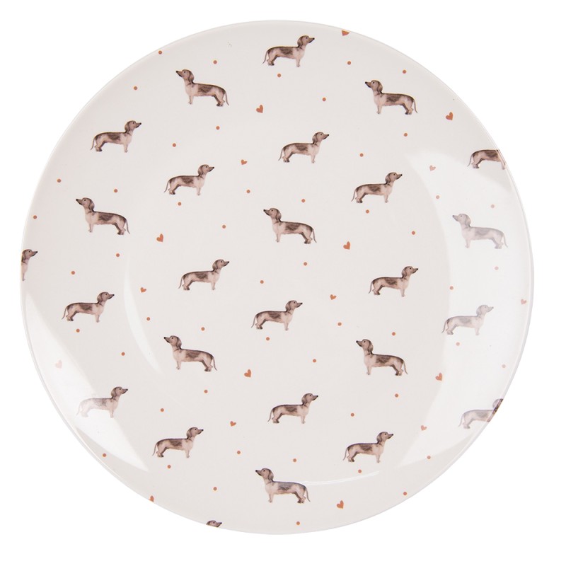 Mooi landelijk beige, bruin porseleinen diner bord met een print van twee teckels van het merk Clayre & Eef. De afmeting is Ø 26x2 cm