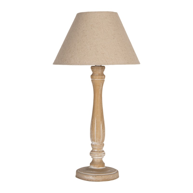 Beautiful brown lamp with a beige shade in a shabby chic style, a perfect decoration for any interior. The lamp is made of wood. The cord length is 109 cm, and the switch is located 13 cm from the lamp.