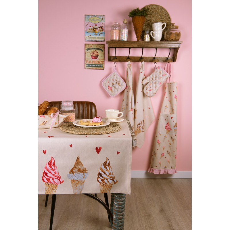 Sweeter than sweet! A cheerful and cute series with a pattern of ice creams and red hearts. The perfect ingredients that make this collection so cute. The pink accents and the off-white background are the perfect base for the beautiful illustrations. Make table moments extra festive with these table runners, kitchen towels, oven gloves, potholders, and bread baskets. There is even a children‘s collection available from this collection. Ice cream is always a good idea!