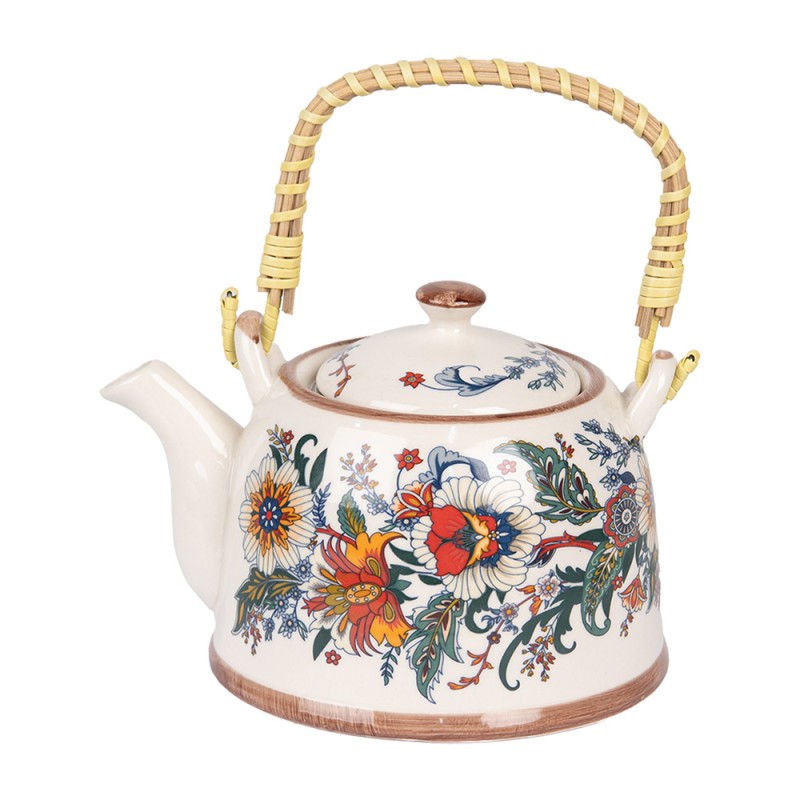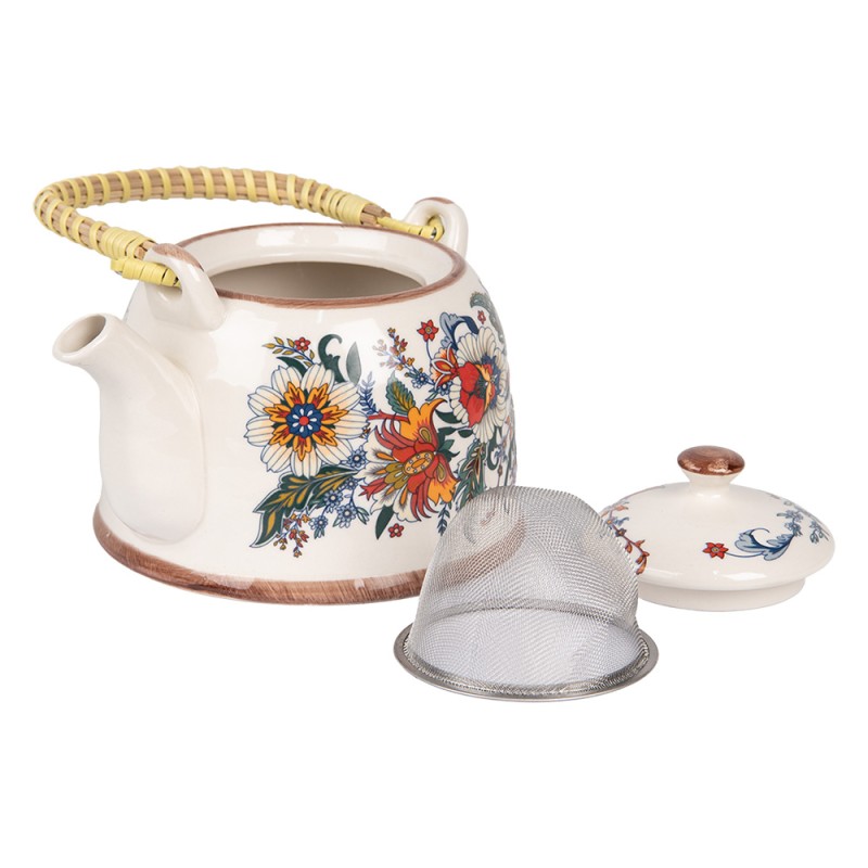 Rustic ceramic teapot with strainer, colorful floral design, and wooden handle. Also great as decoration on an open shelf or a tray.