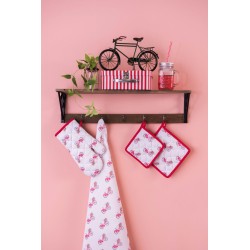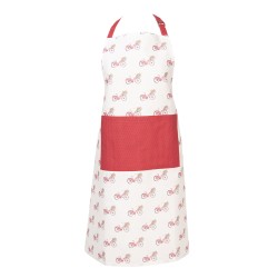 L'adorable vélo rouge est tissé dans un joli motif qui fait honneur à son nom. La bordure rouge à pois blancs contraste joliment avec le fond blanc. La manique, le gant de cuisine et le tablier de cuisine reprennent tous ces éléments et sont également disponibles dans une version pour enfants. La corbeille à pain assortie est très décorative et attire tous les regards sur la table.