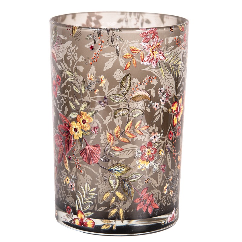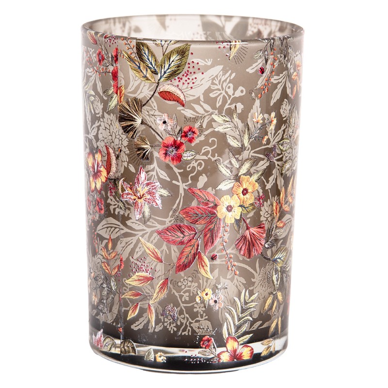 Clayre & Eef Porte-bougie Ø 12x18 cm Gris Verre Fleurs