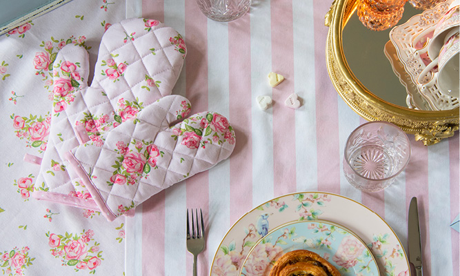 Questa serie è più che dolce! Lo sfondo rosa tenue, abbinato al motivo a rose, costituisce la base allegra e dolcissima di questa linea. Anche le combinazioni con i motivi a pois e a righe rendono il tessuto tutt'altro che noioso. I dettagli in pizzo su articoli come la tovaglia, il cuscino, il grembiule da cucina, i runner da tavola e gli asciugamani da cucina completano perfettamente il tutto. Con questo tessile da cucina, nessuna cena sarà mai noiosa. Puntate sulla dolcezza!