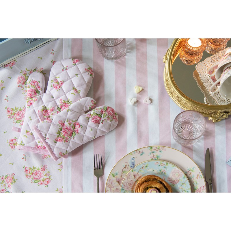 Questa serie è più che dolce! Lo sfondo rosa tenue, abbinato al motivo a rose, costituisce la base allegra e dolcissima di questa linea. Anche le combinazioni con i motivi a pois e a righe rendono il tessuto tutt‘altro che noioso. I dettagli in pizzo su articoli come la tovaglia, il cuscino, il grembiule da cucina, i runner da tavola e gli asciugamani da cucina completano perfettamente il tutto. Con questo tessile da cucina, nessuna cena sarà mai noiosa. Puntate sulla dolcezza!