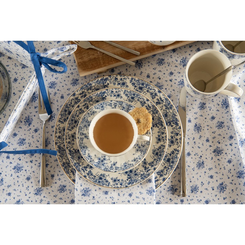 Deze serie staat helemaal in het teken van de blauwe roos. Dit eenvoudige maar zeer sfeervolle textiel is voorzien van een prachtig vormgegeven rozenpatroon in een delfsblauwe kleur. Het blauwe accent in de biezen, maakt het plaatje compleet en de witte ondergrond zorgt voor een frisse look. Het is een zeer complete serie met items als tafelkleden in diverse formaten, tafellopers, placemats en servetten. Voor in de keuken zijn er keukendoeken, pannenlappen, een keukenschort en ovenhandschoenen verkrijgbaar.