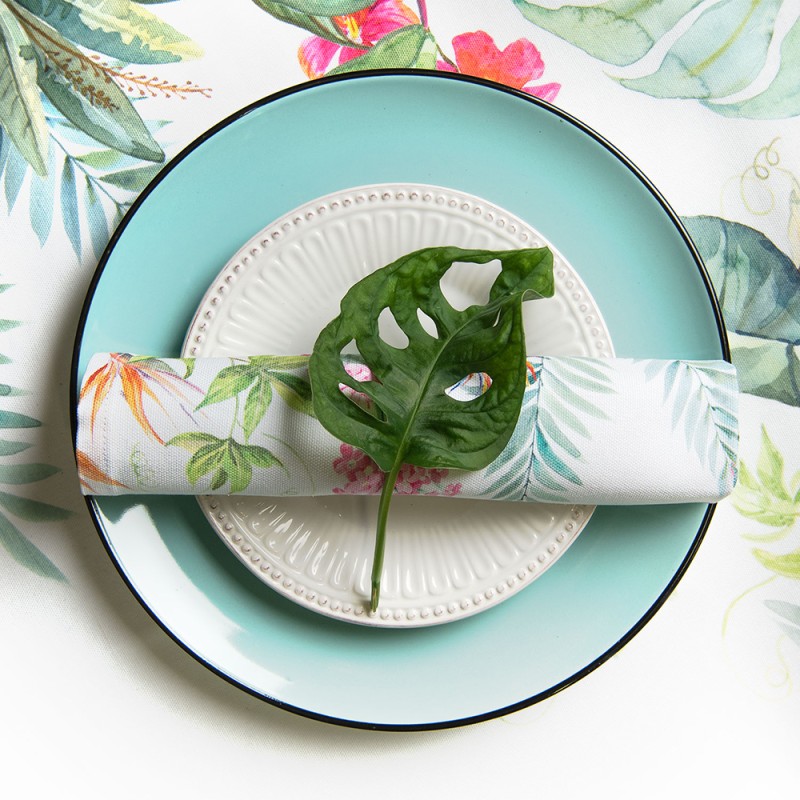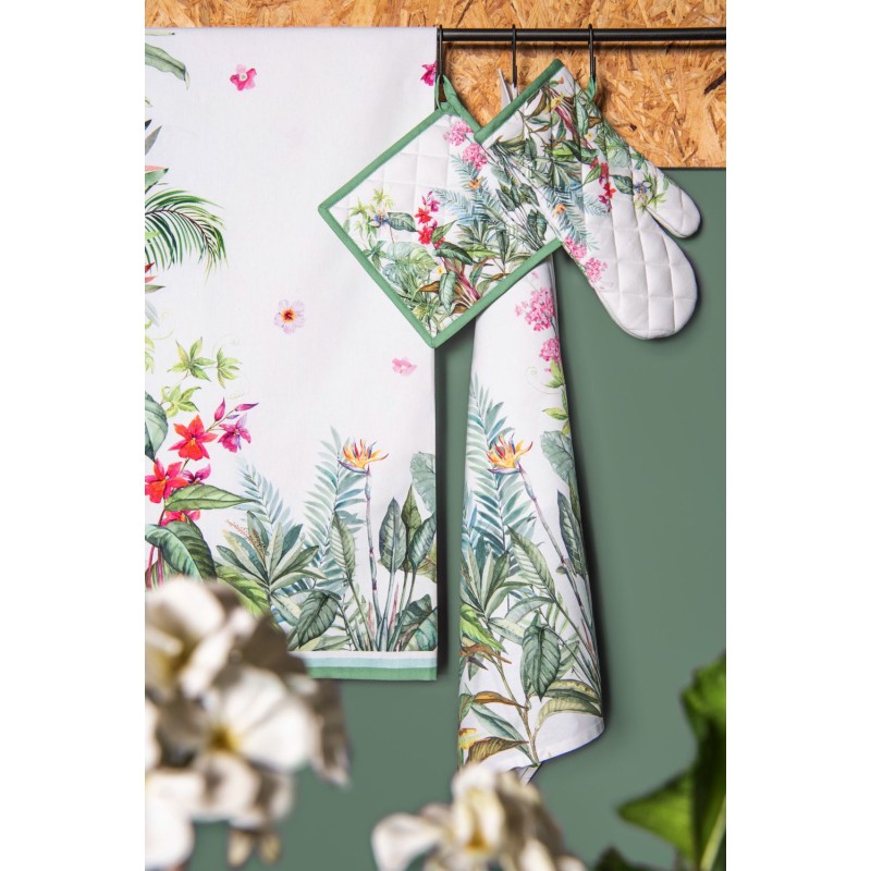 Questa serie offre una sensazione estiva incredibilmente piacevole. Le bellissime stampe botaniche in splendidi colori vivaci sono delle vere protagoniste. Viene quindi naturale pensare ad un arredamento che veda questa serie tessile come punto focale. Sia che tu scelga una tovaglia o un runner, entrambe le opzioni formano una base perfetta per una tavola apparecchiata con atmosfere tropicali. I cuscini decorativi abbinati non solo aggiungono più stile, ma anche comfort. In cucina, i grembiuli e gli asciugamani dal design accattivante daranno anche una vera spinta di colore. Questa collezione di tessuti Jungle Botanics sarà lo sfondo per lunghi drink dopo cena durante le calde serate estive.