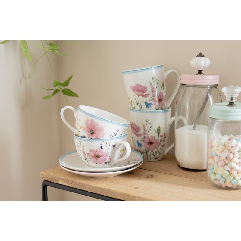 Clayre & Eef Mok set van 6 stuks 360 ml Wit Roze Porselein Bloemen Theemok