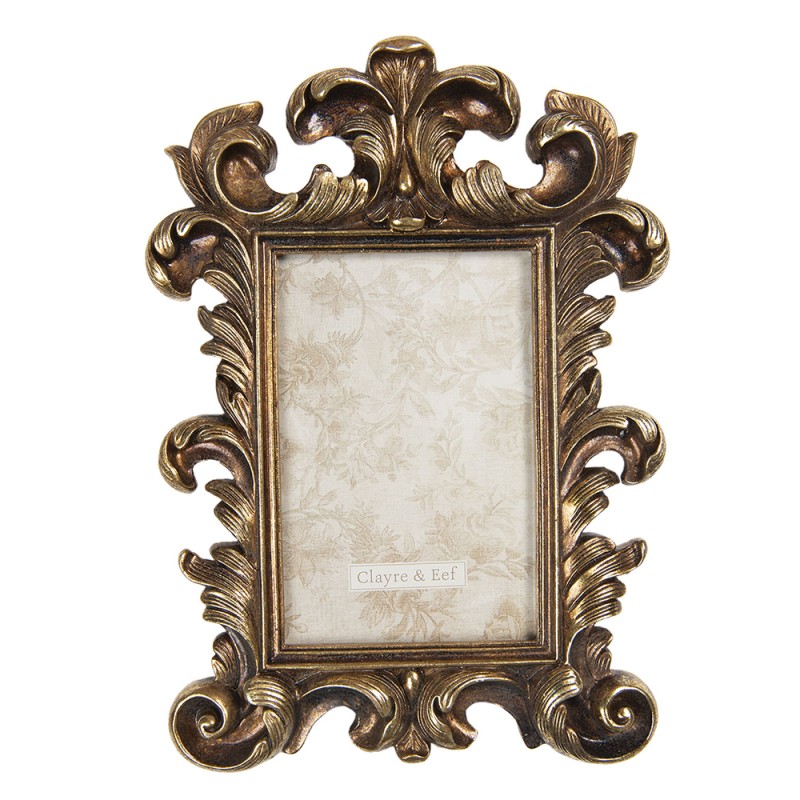 Goudkleurige rechthoekige fotolijst met een klassieke stijl van het merk Clayre & Eef. Afmeting lijst 18x2x27 cm