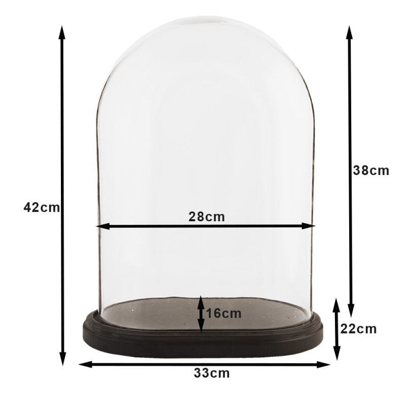 DECORATIEF GLAZEN STOLP: Onze glazen bel is 42 cm in hoogte (inclusief de basis) en heeft een totale basis diameter van 33x22 cm. De binnen diameter van het glas is 29x18 cm. De totale hoogte van het glas (exclusief basis) is 38 cm.