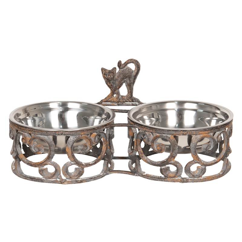 Voer/Drinkbakken van het merk Clayre & Eef. Krullen met een kat als motief in een landelijke stijl met een vintage uitstraling. Geschikt voor honden en katten.