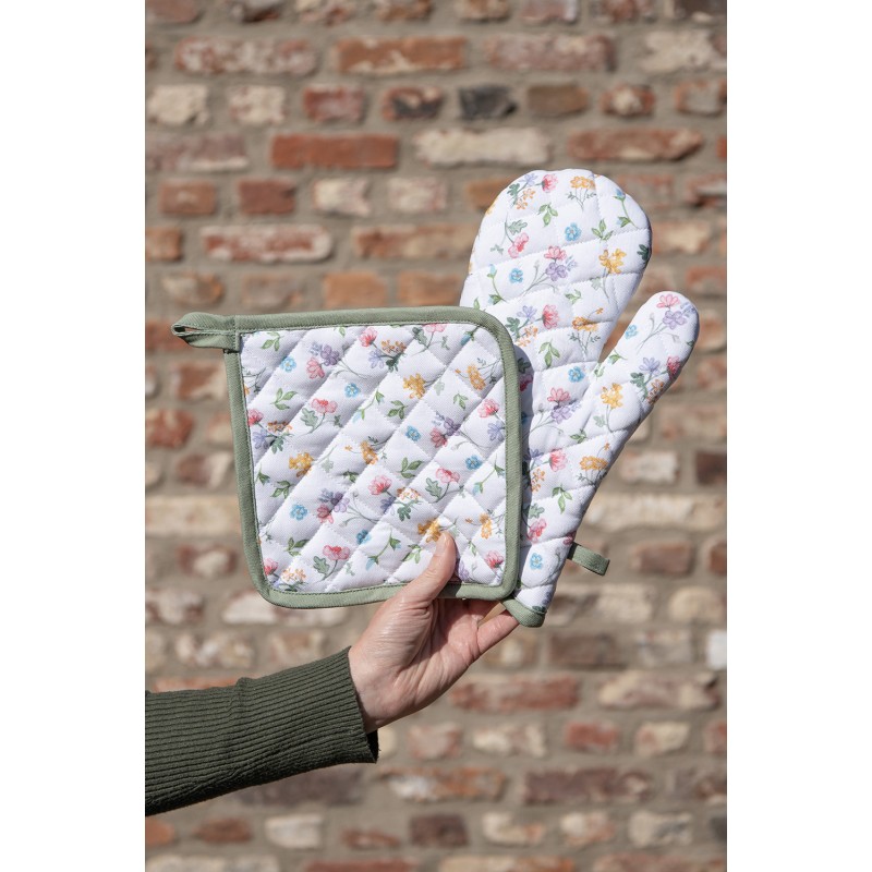 Deze ultiem vrolijke textielserie brengt de fauna bij je aan tafel èn in de keuken. Een frisse ondergrond zorgt voor een neutrale basis, waardoor het lieflijke bloemetjes patroon enorm goed tot zijn recht komt. De groene biezen zorgen voor een mooi contrast op items als het kussen, broodmandje en het keukenschort, maar ook op de keukendoek, pannenlap, ovenhandschoen en het tafelkleed. Ontdek deze snoezige collectie en haal het gehele jaar door de lente in huis. Spring vibes!