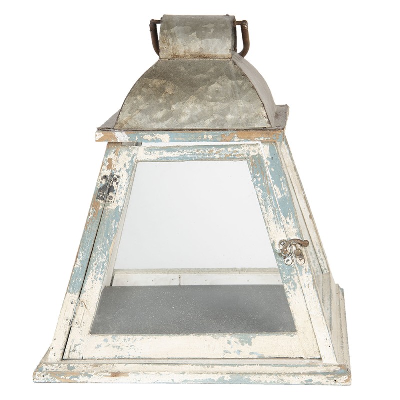 Beige houten vintage lantaarn van het merk Clayre & Eef. De lantaarn heeft een schuifje aan de voorkant, zo kun je de lantaarn makkelijk open en dicht maken.