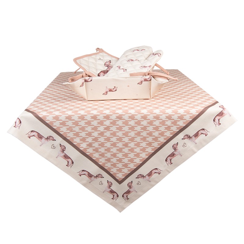 Wie is er nu niet gek op Teckels! Dit vrolijke maar eigenwijze ras, staat centraal in deze textielcollectie. De mooie bruinaccenten en vrolijke patronen laten het hart van elke hondenliefhebber sneller kloppen. De ovenhandschoen, pannenlap en ovenschort is zowel voor volwassenen als kinderen beschikbaar. De sierkussens geven extra sfeer en tovert elke ruimte om tot een gezellige ruimte. De stoffen broodmanden, theedoeken, tafelkleden en tafellopers zijn allemaal fraai vormgegeven en vormen een mooi geheel aan tafel en in de keuken.