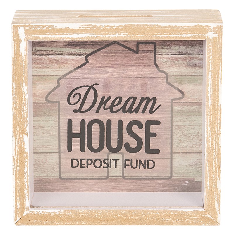 Bruine houten landelijke spaarpot met de tekst "Dream house deposit fund" van het merk Clayre & Eef.
