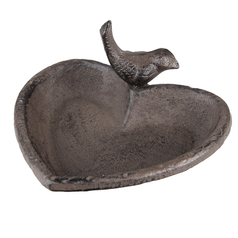 Leuke decoratieve bruine ijzeren vogelvoederschaal, in de vorm van een hart, met op de rand een figuur van een vogeltje, in een landelijke stijl, van het merk Clayre & Eef.